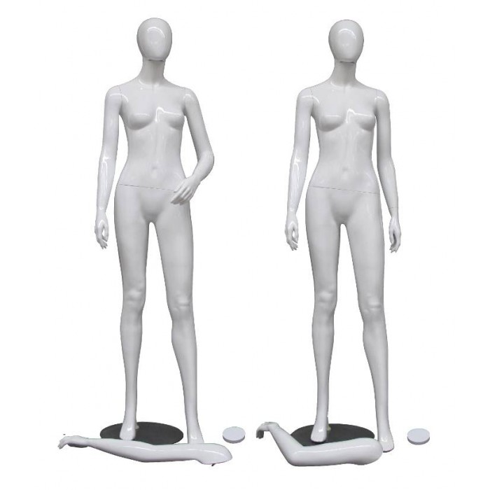 Manichino donna stilizzato in polipropilene plastico laccato bianco lucido, dotato di accessori ,per creare più posizioni .puoi sganciare la testa e inserire il tappo o cambiare le braccia; gli accessori compresi sono : n°1 braccio dritto destro n°1 braccio dritto sinistro n°1 braccio piegato sinistro n°1 tappo copri collo n°1 testa uovo base in cristallo attacco al polpaccio