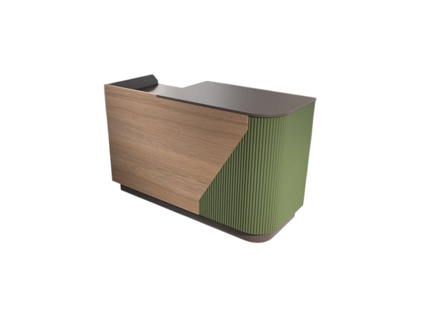 Banco cassa con angolo curvo in MDF fresato cannetè verniciato verde , frontale rovere , top e scocca e interni in nobilitato lava .