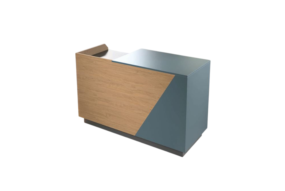 Banco cassa bicolore , in nobilitato rovere e Blu laguna .scocca grigia