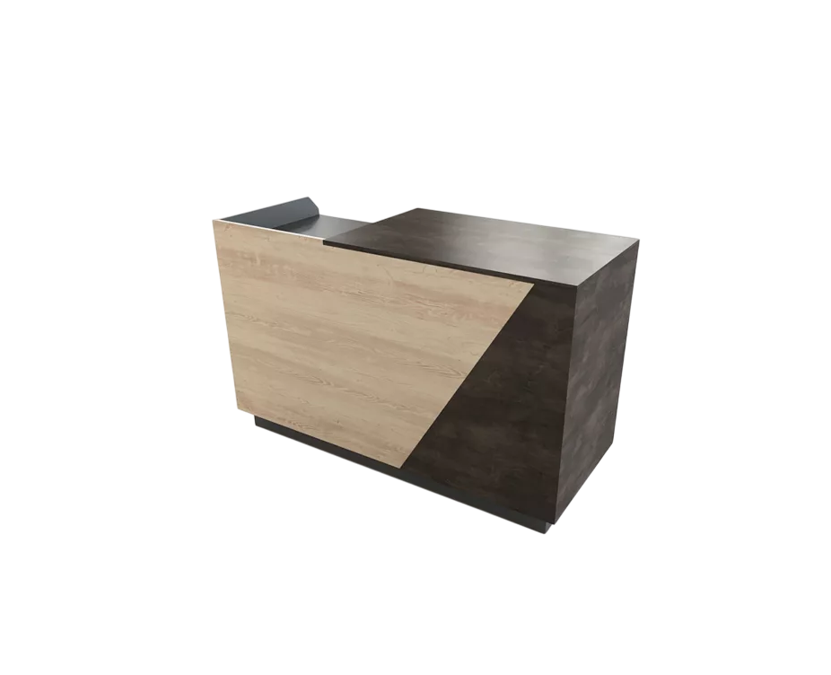 Banco cassa bicolore , in nobilitato rovere scuro e rovere chiaro .scocca grigia