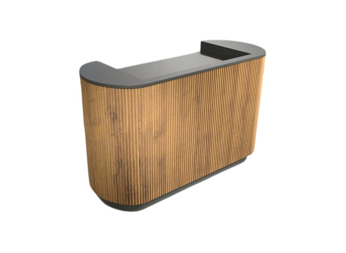 Banco cassa ovale con frontale in legno massello Tiulipier cannetè verniciato trasparente , scocca e interni in nobilitato grigio .