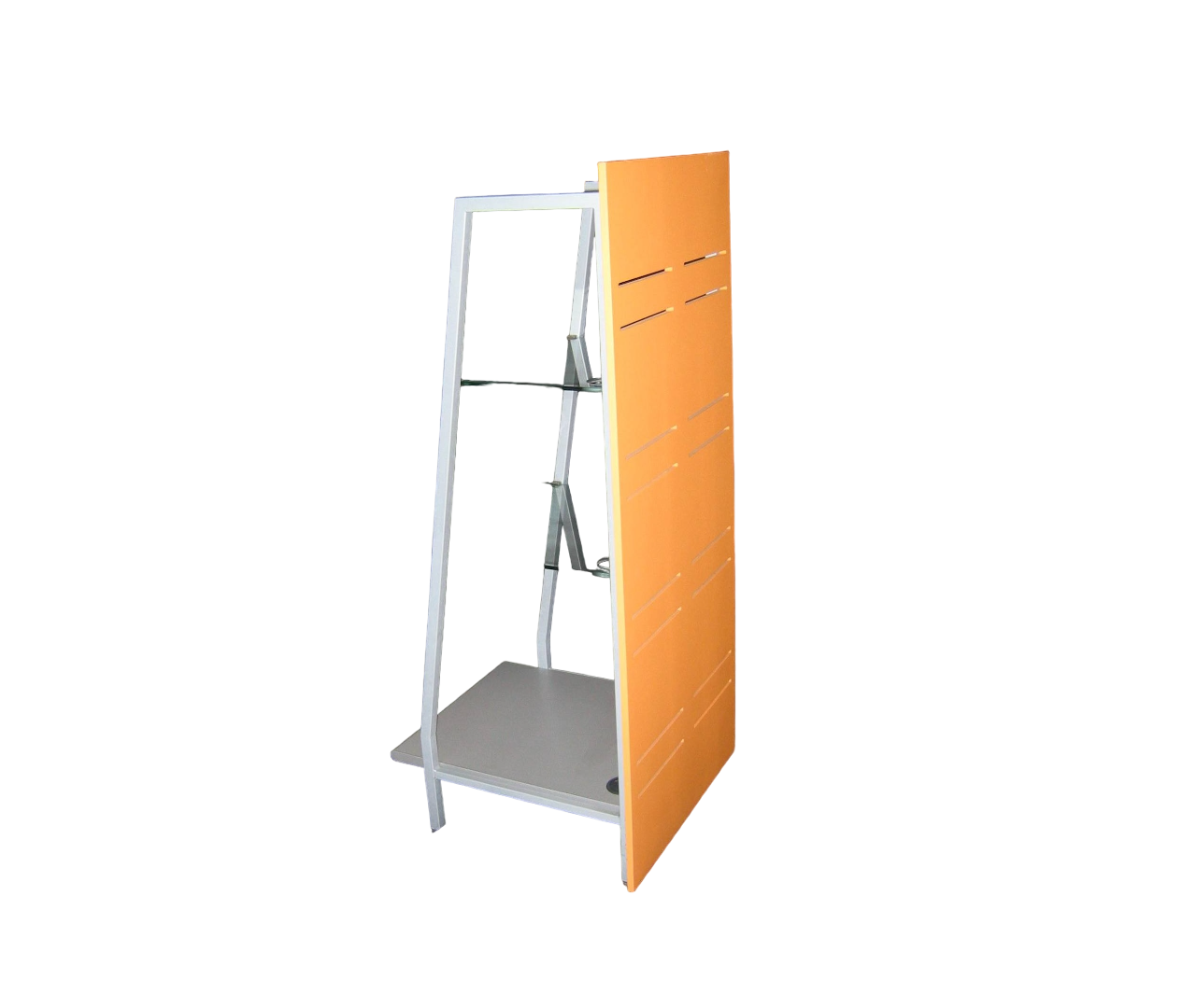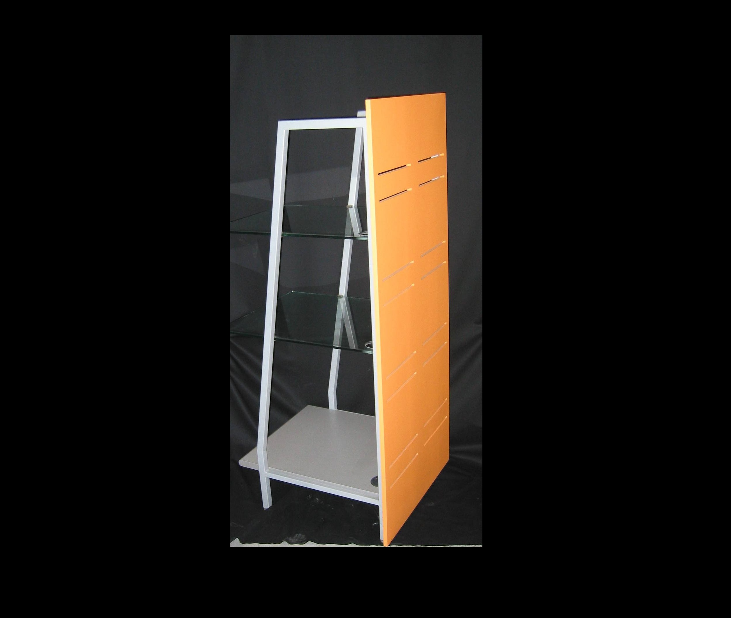 Banco porta computer, frontale laccato arancione ,struttura in tubo di ferro 25×25 verniciato grigio alluminio,