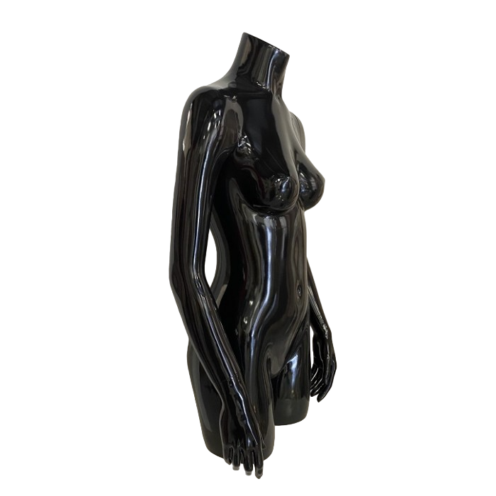 Busto donna senza testa con braccia dritte sui fianchi in vetro resina laccato nero RAL 9005