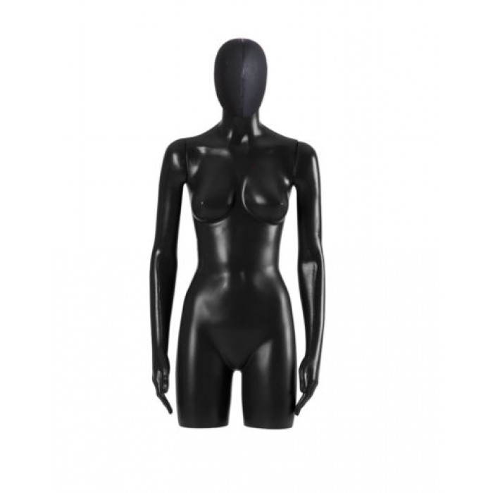 Busto donna con braccia e testa uovo , con inizio gamba in modo da indossare bene sia un intimo che un pantalone .realizzato in polietilene verniciato nero opaco , materia atossica e 100% riciclabile, che conferisce al manichino leggerezza e resistenza.