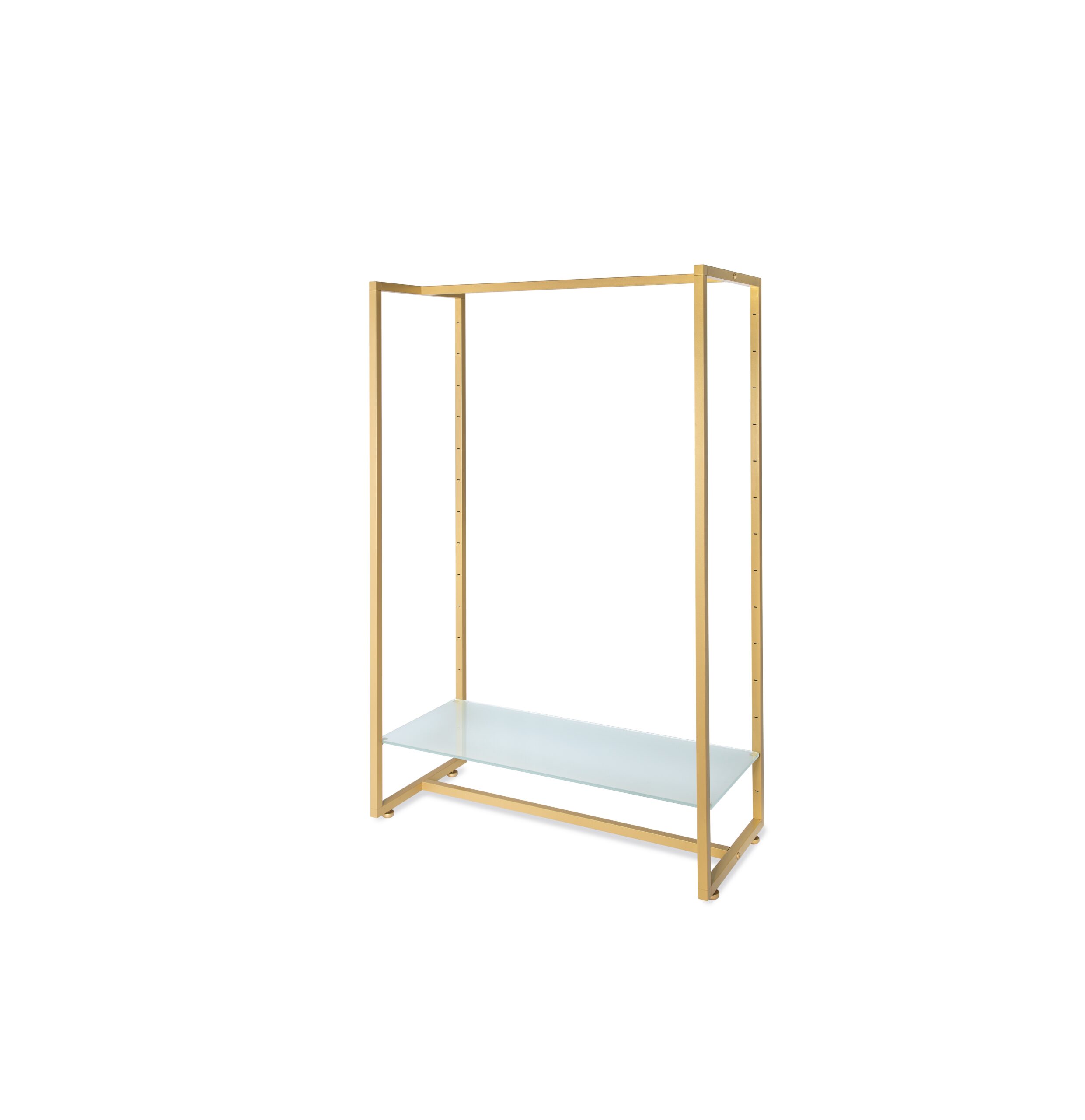 Gondola centrale in tubo quadro oro e asolato con barra appenderia cm.99 e piano in cristallo temperato acidato cm.99×40