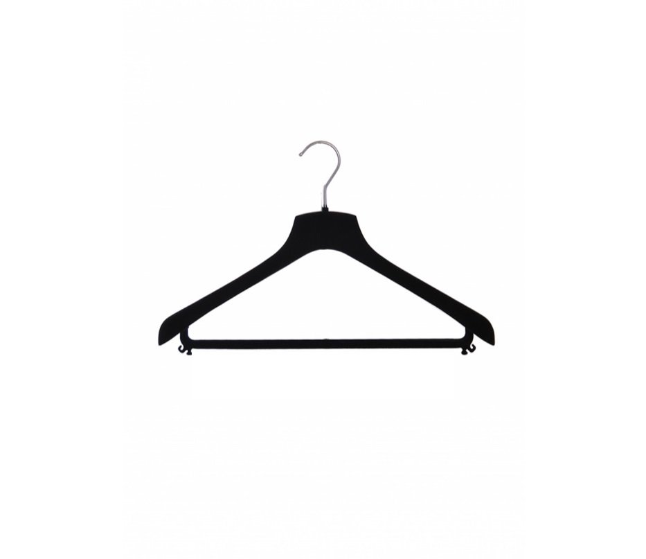 Grucce appendiabito leggera in plastica floccata nera . Larghezza cm 42, spessore spalla cm 3,5