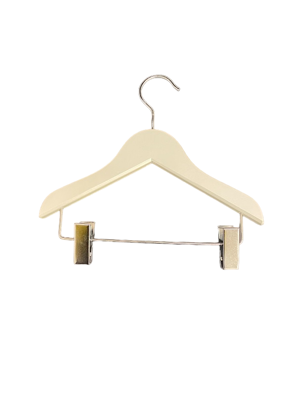 Gruccia legno faggio verniciata bianco perlaceo , con pinze cm.26 spessore cm.1,3 , pinze e gancio cromato .