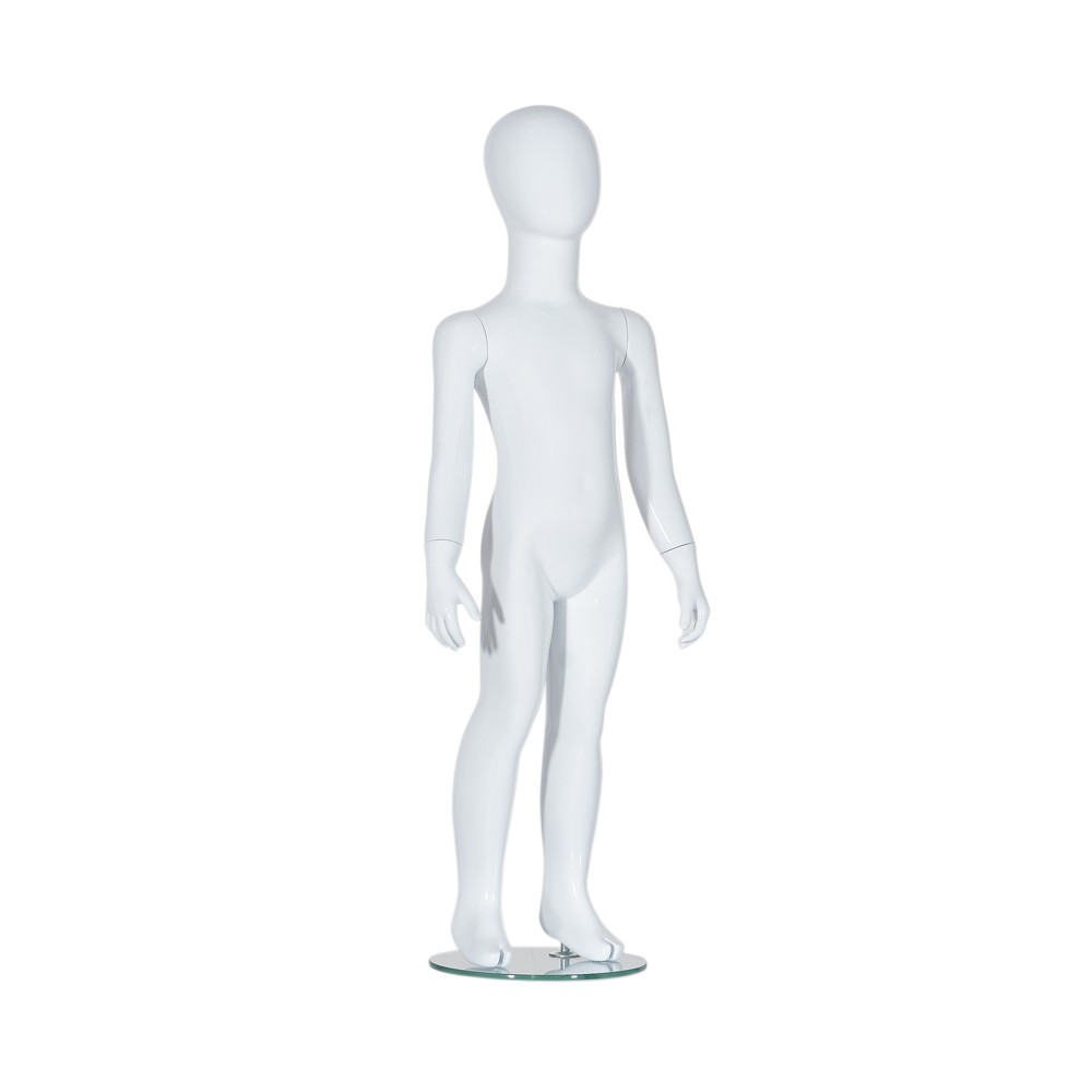 Manichino bambino dalla testa a uovo di età 5/6 anni realizzato in vetroresina Bianco opaco, Il manichino è completo di base rotonda in cristallo temperato