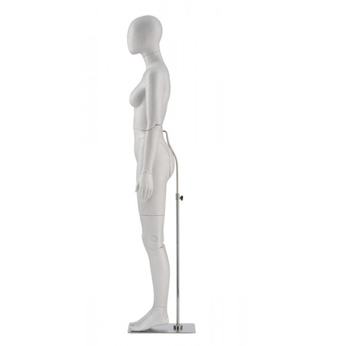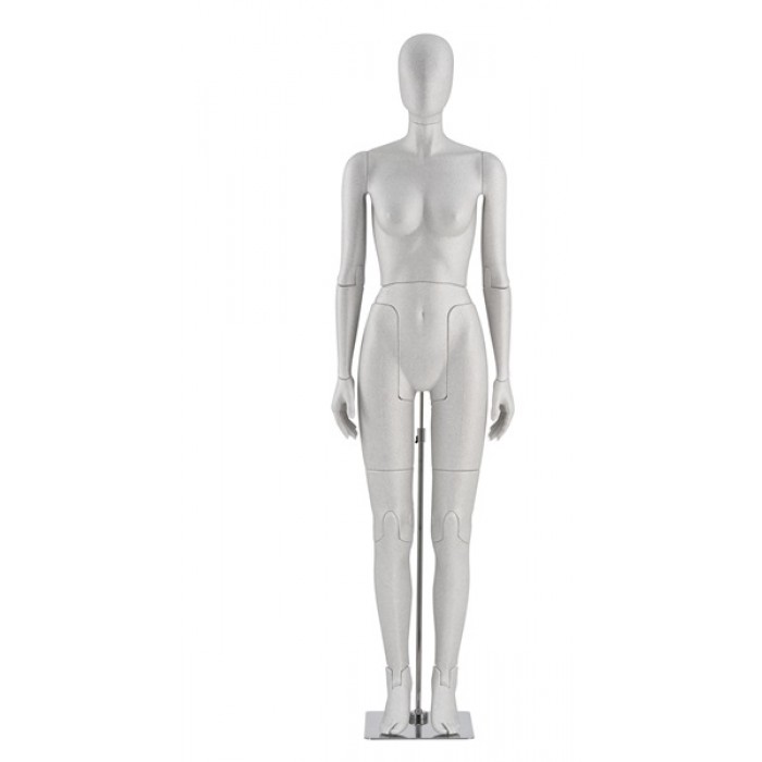 Manichino donna articolato con testa uovo in polipropilene espanso colore grigio la sua leggerezza la robustezza e la mobilità degli arti , fa si che si riesca a far assumere tantissime posizioni . completo anche di base metallo nero attacco vita , cm.28×38