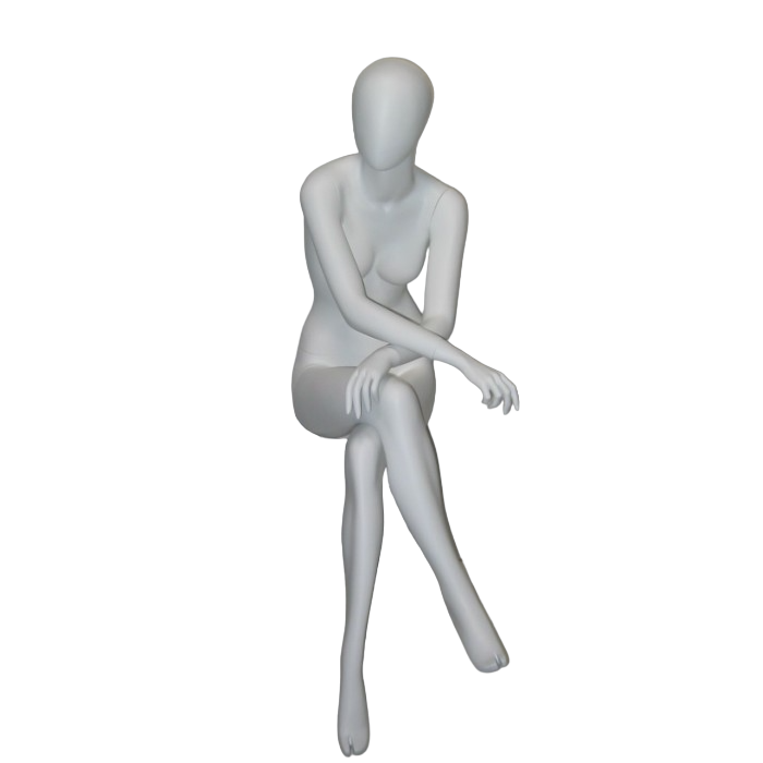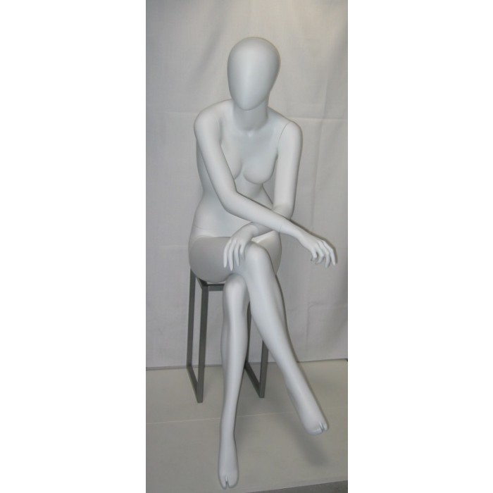 Manichino astratto donna testa a uovo in vetroresina bianco opaco posizione seduta