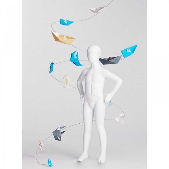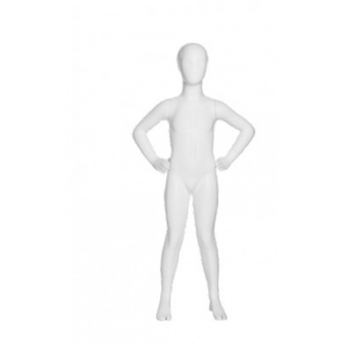 Manichino bambino 4/5 anni collezione Elite Kids , testa stilizzata , finito nel colore bianco opaco, base tonda in cristallo con doppio attacco polpaccio e attacco sotto al piede.