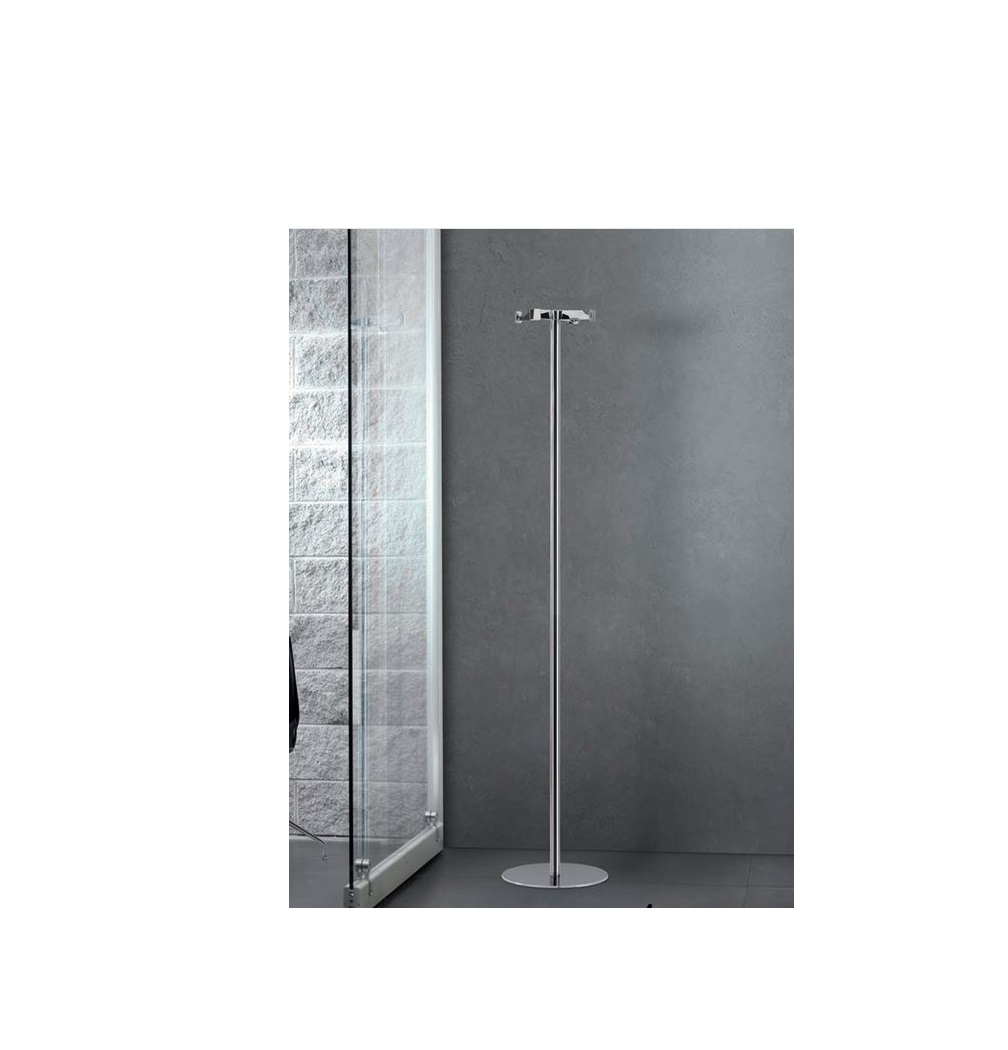 Portabiti a piantana interamente in metallo, Testa in zama e tubo centrale in acciaio cromato, e base tonda in acciaio inox lucido.