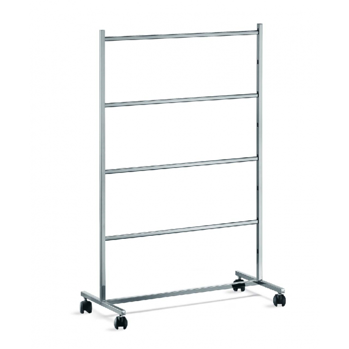 Stender lineare a 4 barre ovali estraibili cromato. Particolarmente ideale per l’esposizione di biancheria intima , abbigliamento bambini o accessori , ma anche di abiti che necessitano della totale lunghezza potendo oltremodo estrarre tutte le barre interne.