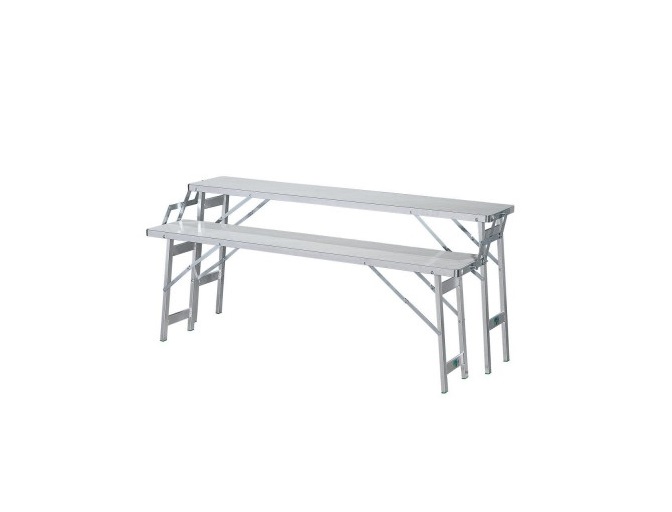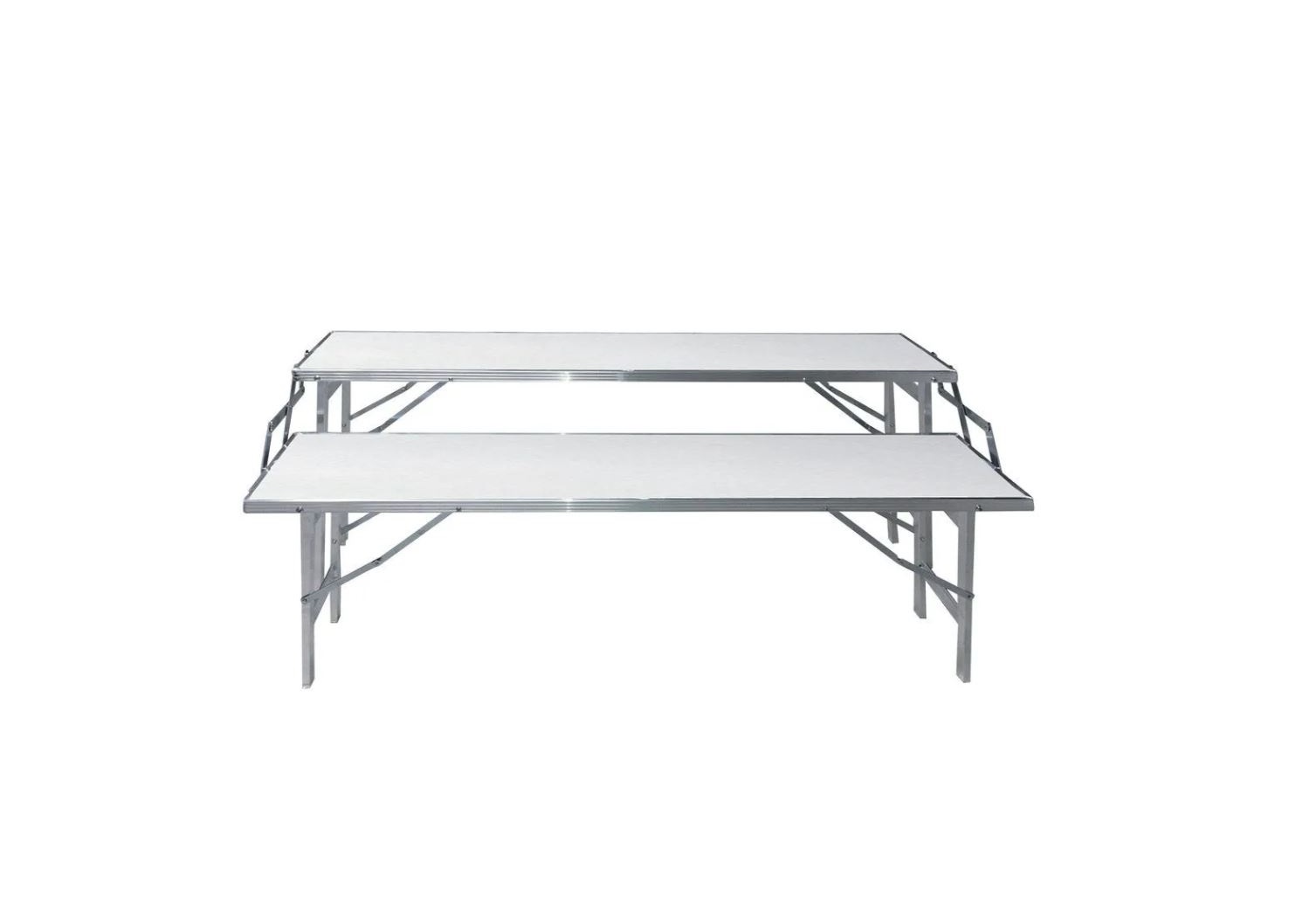 Tavolo da mercato a due scalini , struttura in alluminio ,piani rivestiti in resina bianca , pieghevole .