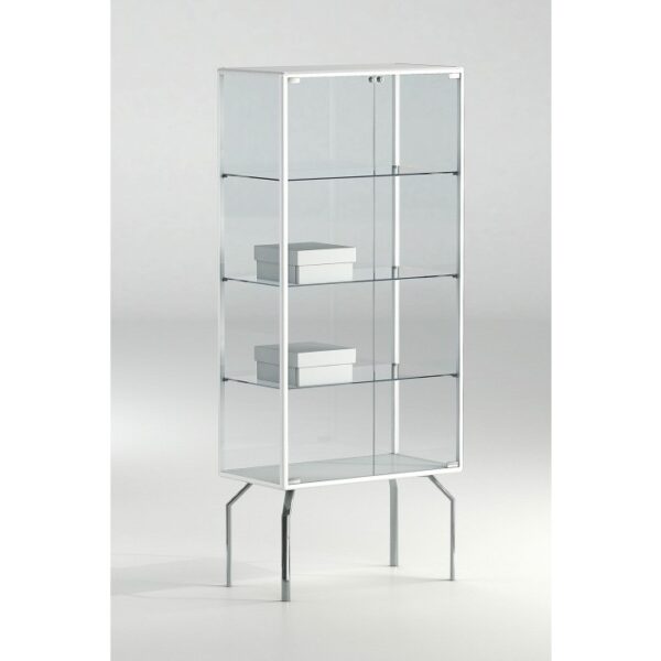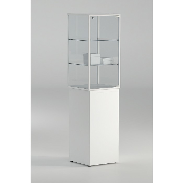 Vetrina a Teca con profili in alluminio in colore bianco , cristalli temperati 5mm , n.1 anta a battente con serratura n°2 ripiani crisallo 6mm e base in legno bianco h.90 con misura cm.46x46x177h Tempi di realizzo 7/15 giorni data ordine