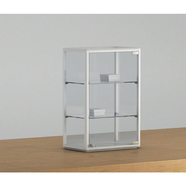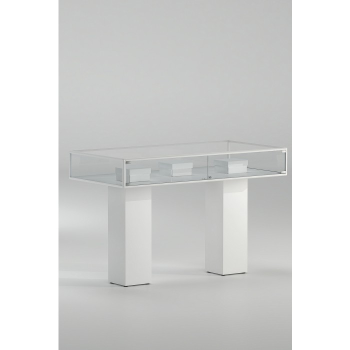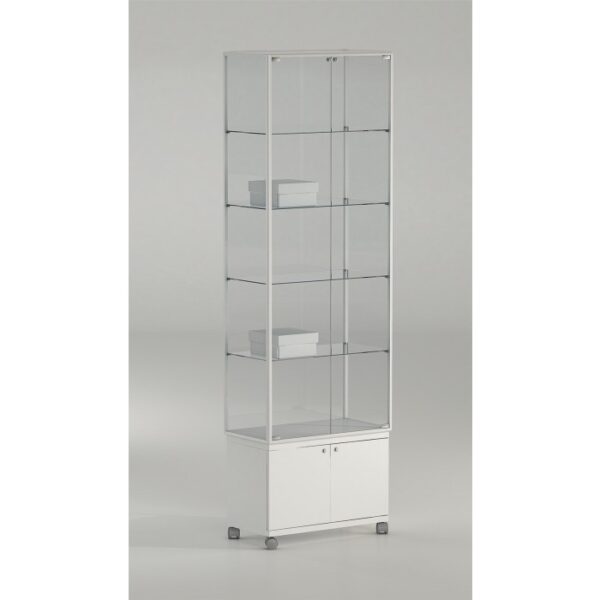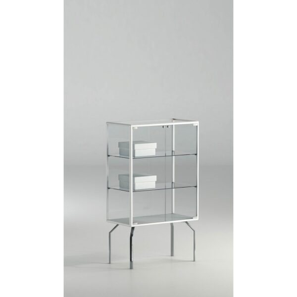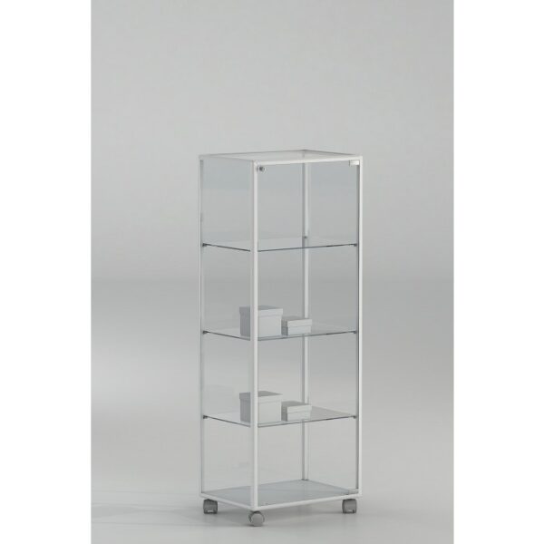 Vetrina a Teca con profili in alluminio in colore bianco , cristalli temperati 5mm , n.2 anta a battente con serratura e 2 piantane in legno bianco misura cm.159x78x106h Tempi di realizzo 7/15 giorni data ordine