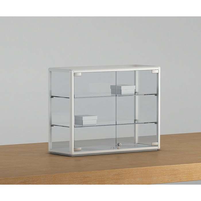 Vetrina da banco con profili in alluminio in colore bianco , cristalli temperati 5mm conpleta di n. 2 ripiani di 6mm regolabili in altezza , n. 1 anta a battente con serratura misura cm.63x23x51h Tempi di realizzo 7/15gg data ordine