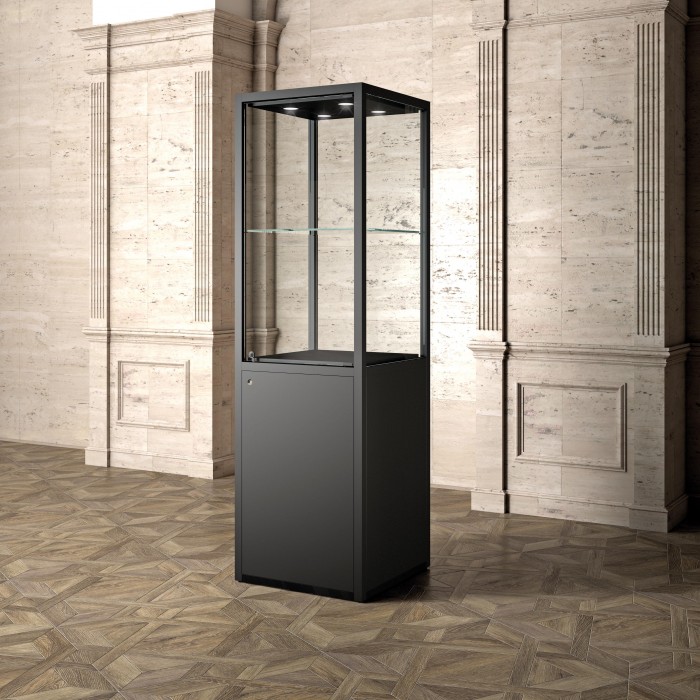 Vetrina Museale montata struttura in ferro verniciato nero opaco , cristalli temperati 8 mm.e serrature n°1 ripiano ,Topo completo di n°4 faretti led 4.000°k negli angoli con pannelli di chiusura sottostante misura complessiva cm.60x60x200h Tempi di realizzo 10/20 giorni data ordine A RICHIESTA CON RICALCOLO COSTI – misure e colori speciali – vaschetta per regolazione umidità relativa con sali igroscopici – cristalli stratificati, cristalli extrachiari – ripiani supplementari – illuminazione con striscia led